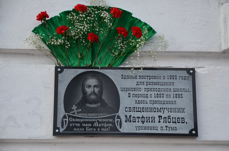 14 ноября было совершено торжественное открытие мемориальной доски памяти священномученика Матфия Рябцева на здании бывшей церковно-приходской школы, преподавателем которой был прославленный святой. Торжественный молебен и освящение доски возглавил благочинный Клепиковского благочиния иерей Симеон Правдолюбов в сослужении священников благочиния. На освящении присутствовали глава муниципального образования Тумское городское поселение Владимир Викторович Шатайкин и глава администрации Тумы – Виктор Михайлович Лазарев. На освящении присутствовали школьники тумских школ и школы с.Оськино. Все школьники и участники торжественного молебна получили на память краткие брошюры с житем свщмч. Матфия Рябцева.